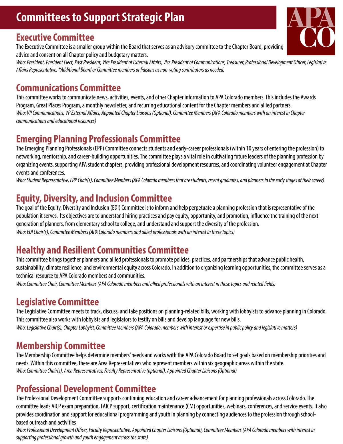 The Strategic Plan of the Colorado Chapter of the American Planning Association (APA Colorado) include overarching goals, general strategies, and specific action items to guide and direct the Chapter toward fulfillment of the organizational mission and vision. The Chapter's Strategic Plan is supplemented with strategic action items to assist the Chapter in working towards it's goals.